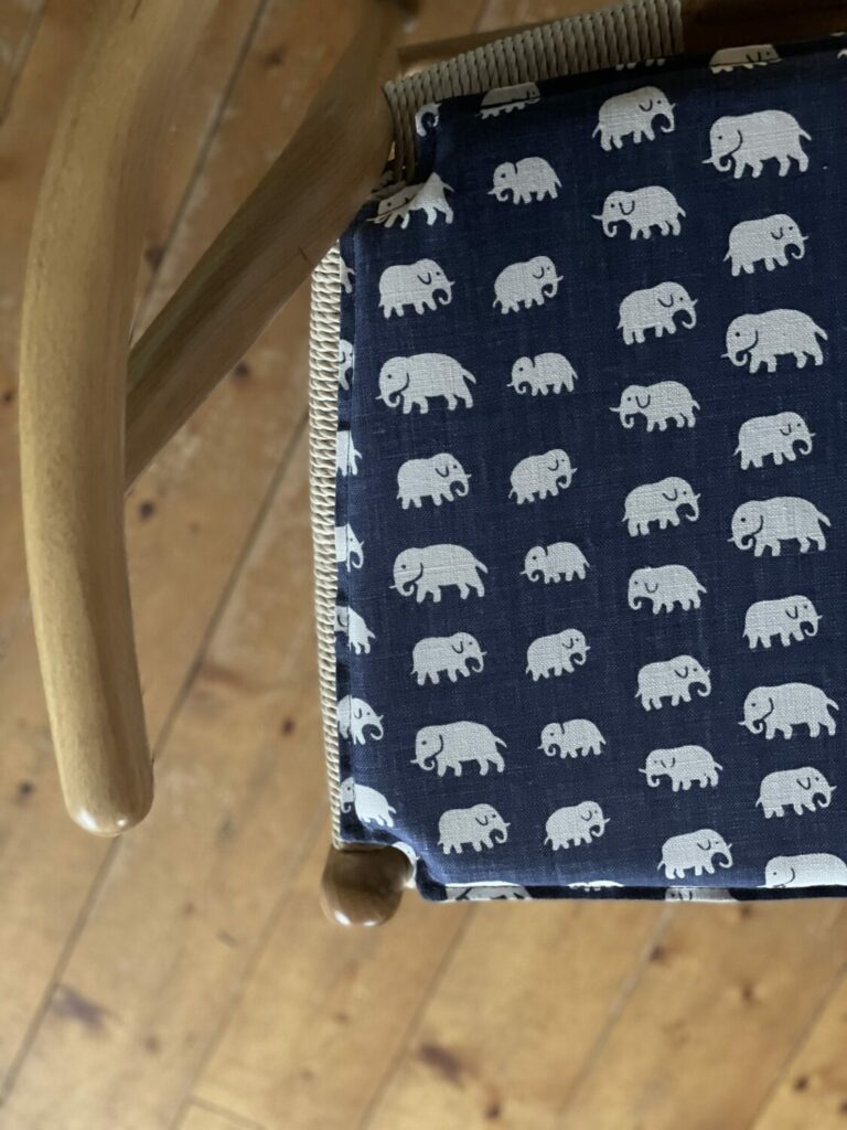 Løs pute til Y-stolen er sydd i Elefant stoffet til Svensk tenn. Stoffet er det eneste tekstilet Estrid Ericson designet og inspirasjon kom fra et afrikansk tekstil som hun fant på et marked i Paris. Vi syr puter til de fleste stoler på mål og for pris send mail til lene@mobeltapetserer.com
